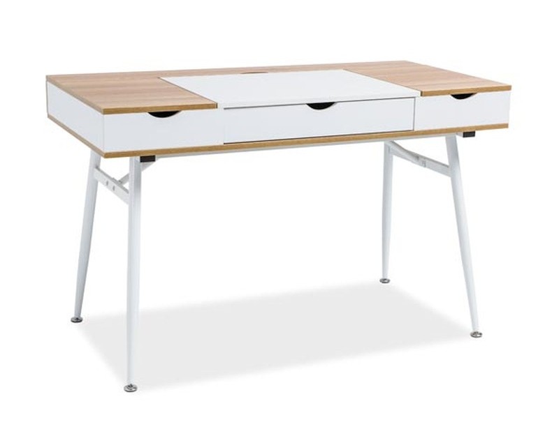 Biurko, blat: płyta wiórowa laminowana, kolor: dąb + biały, stelaż:metal, kolor: biały.