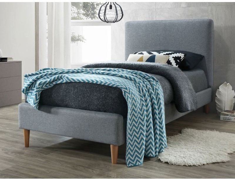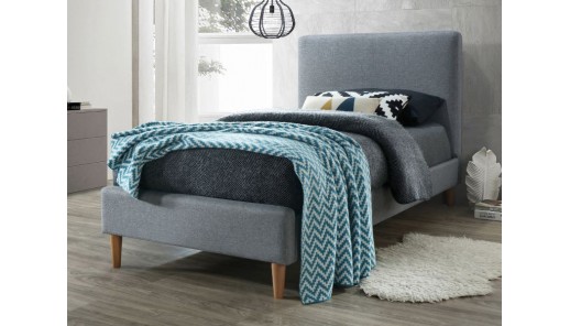 Łóżko, tkanina, kolor: szary, tap. 131. zawiera w komplecie stelaż z listew giętych osadzonych w elastycznych uchwytach.