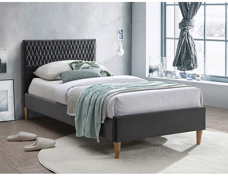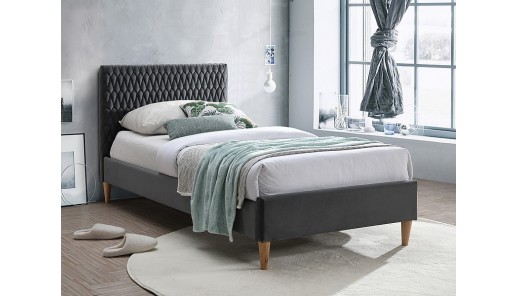Łóżko, aksamit, zawiera w komplecie stelaż z listew sprężynowych osadzonych w elastycznych uchwytach. W kolekcji Azurro dostępne szafki nocne i skrzynia.