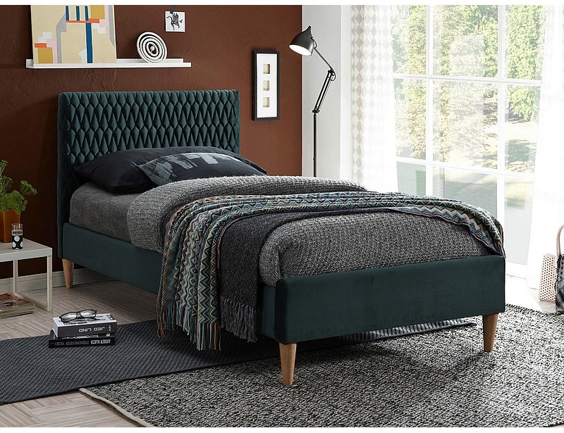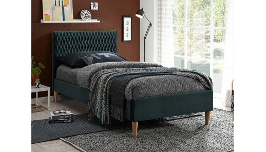 Łóżko, aksamit, zawiera w komplecie stelaż z listew sprężynowych osadzonych w elastycznych uchwytach. W kolekcji Azurro dostępne szafki nocne i skrzynia.