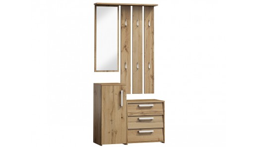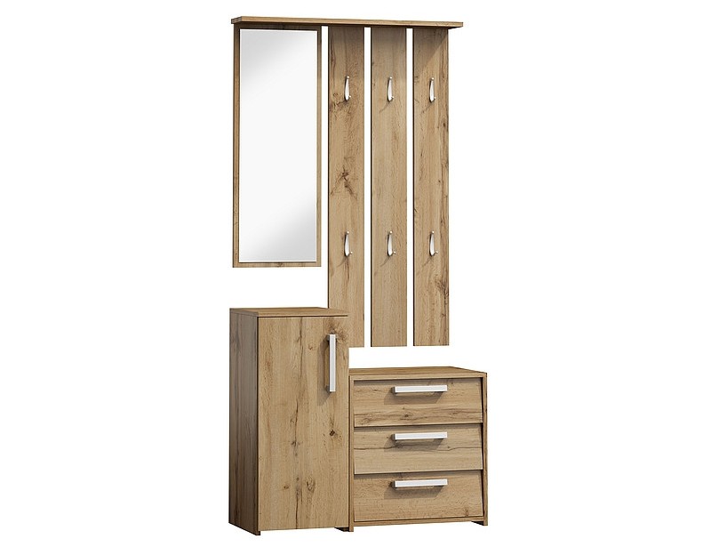 Zestaw do przedpokoju, składający się z dwóch szafek oraz wieszaka z lustrem. Płyta laminowana.
