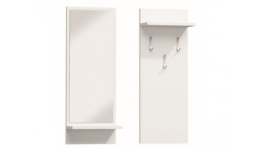 Zestaw do przedpokoju, składający się z szafki z tapicerowanym siedziskiem, lustra oraz wieszaka. Płyta laminowana.